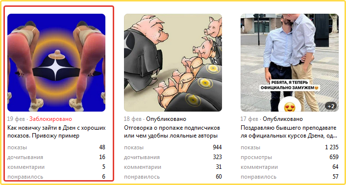 Ничего не понимаю. Точнее понимаю, но не хочу в это верить. Потому-что все возможные претензии к статье могут привести максимум к пессимизации, но никак не к блоку. За единственным исключением — стандартной формулировки для удаления неугодных статей: "Поступила официальная жалоба". Что же могло испугать классных ребят настолько, что они решили заблокировать примитивный материал в несколько предложений, который уже успел обрасти комментариями и лайками? Я бы еще поняла недовольство предыдущими статьями, но этой... Статья Кто не успел прочесть, вот она полностью: Неужели малыши стесняются своих махинаций с приглашенцами? Никогда в такое не поверю. Да и чего бояться, когда всем об этом давно известно. Как и известно и о склонности нового Дзена к попам (не путать со священнослужителями). Единственное, что могу предположить — конкретный классный ребятенок или скаутенок обратился по поводу блокировки статьи, так как она нивелирует их труд по привлечению в Дзен известных попокруток. Я коне