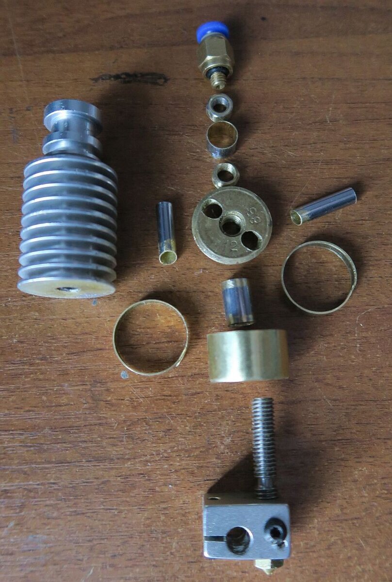 Собирался заняться водянкой попозже, но принтер решил заставить делать это немедленно. Делая детали для блока управления, решил кнопочку пуска делать зеленой, а для этого надо менять филамент. Утром тискаю кнопу "смена филамента", а предыдущий АБС мертво сидит в головке. Ничего не поделаешь, надо "трясти стариной" и делать водянку, иначе эти сюрпризы будут регулярными... И вот чего "натряс"... Для емкости охлаждающей термобарьер применил 2 латунные гильзы 12 калибра под капсюль "жевело". Дырка под капсюль 5,6мм, самое то для нарезки резьбы под барьер. Для подвода шлангов очень подошли куски телескопической антенны диаметром 5мм., а 8 мм пошли на соединение и спайки гаек М5 и М6 для сборки частей емкости водянки, словом смотрите на фото. Пайка производилась специальным комплектом для медного водопровода в квартире. Еще в прошлом веке менял самостоятельно трубы на медь. Стоит все отлично, и в стену врезать удобно, гарантия 50 лет. Паять горелкой газовой, мазнул флюсом, нагрел и коснулся