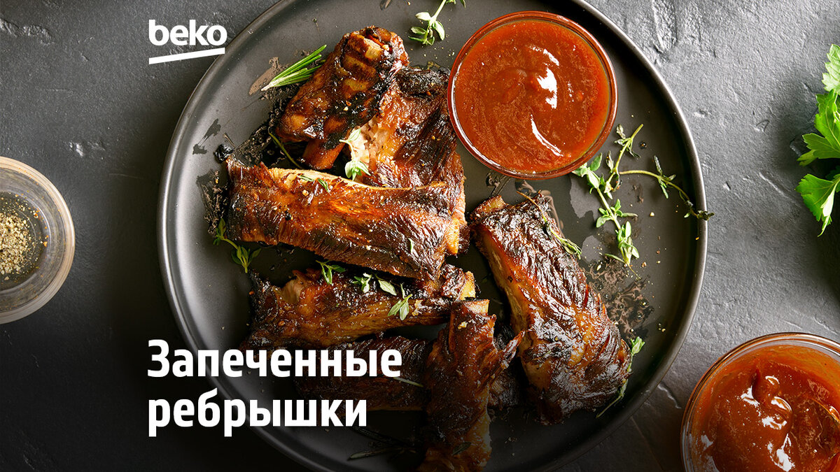 - Промаринованные ребра выкладываем в форму для запекания или на противень и запекаем 1-1,5 часа в духовке Beko BBIE12300XD, разогретой до 160 градусов. Во время приготовления ребрышки необходимо несколько раз обмазать соусом. Готовые ребрышки выкладываем на тарелочку, украшаем зеленью и подаем с тем гарниром, который вам больше нравится.