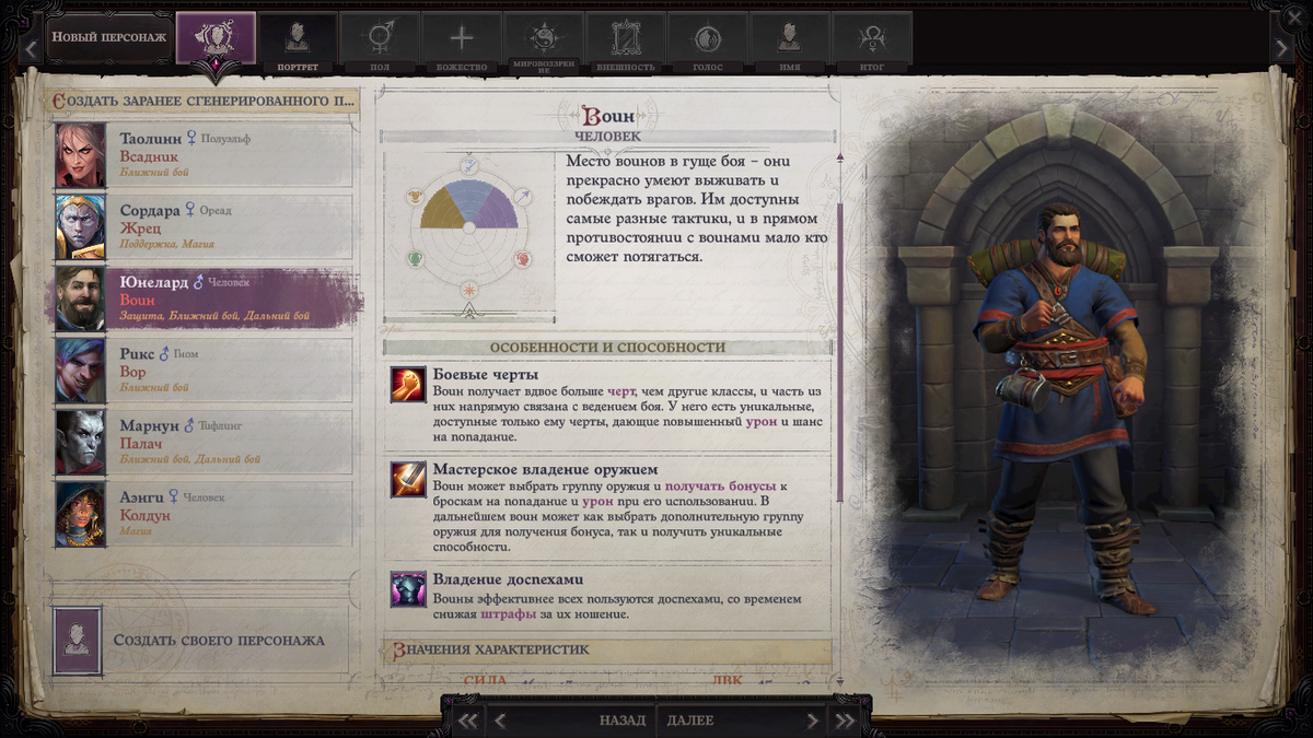 При распределении характеристик советую поднять ключевую до 17, так как по ходу игры герой сможет пять раз повысить любую характеристику на 1, и в итоге получится четное значение, а вы на старте сэкономите 4 очка и вложите их во что-то другое.