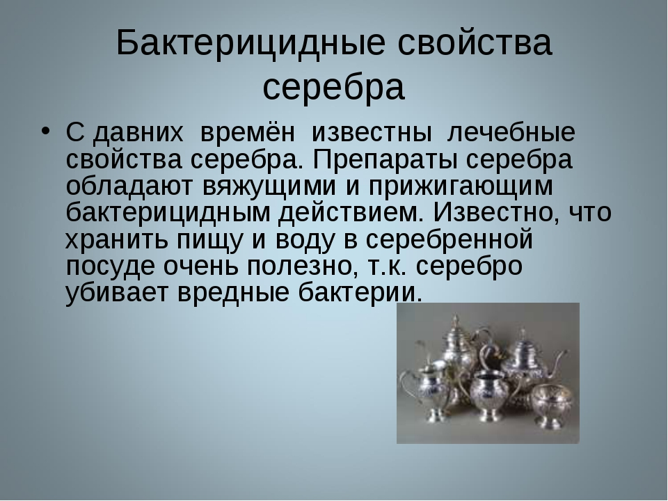 По эффективности очищения жидкостей от вирусов и бактерий серебряная посуда даже сильнее, чем хлорка или марганцовка. Принцип очищения у серебра такой же, как у антибиотиков. Многочисленные опыты, проводимые учеными, подтверждают, что палочка тифа при действии серебра погибает менее чем за 24 часа, палочка дифтерии — за трое суток. Благодаря свойствам серебра можно избавиться от грибков, ионы серебра приостанавливают их рост и дальнейший процесс развития. Влияние серебряной посуды на организм Ионы серебра имеют положительное влияние на человеческий организм. Обогащенная серебром вода способна не только справляться с вирусами, но и поддерживать иммунитет, укреплять его, что особенно важно в периоды массовых простудных эпидемий. Обогащенная серебряными ионами вода помогает справиться с зубной болью, с ожогами, ранами, простудами. При всех своих положительных свойствах и схожести с антибиотиками, в отличие от них, серебро не убивает полезную микрофлору внутри человека, не вызывает дисбак