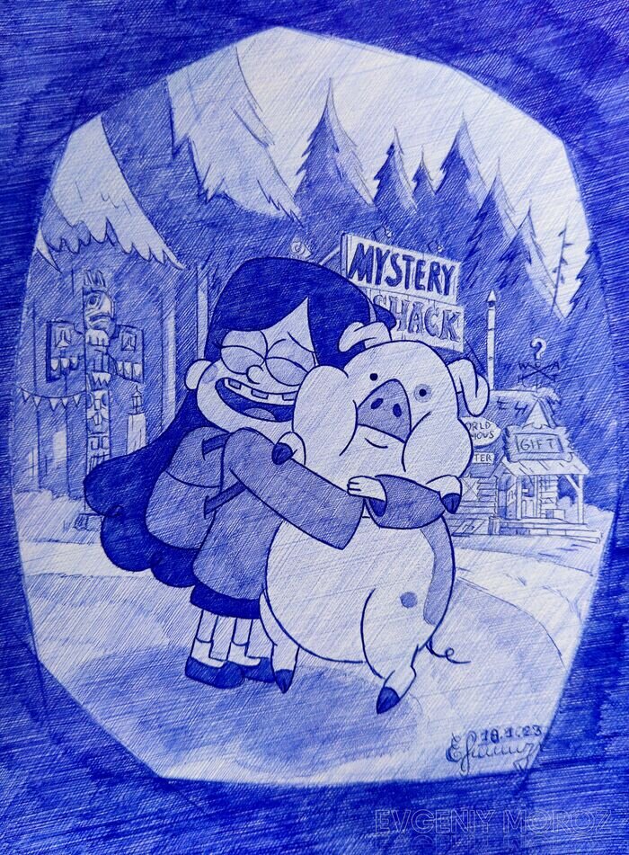 Мой новый рисунок 🙂. Долго думал, чтобы его нарисовать. После раздумий было принято решение изобразить персонажей из мультсериала. Плюс я давненько не рисовал мультяшек. Работа получилась простенькой со своими недочётами, но итог мне всё равно нравится. Использовал: бумагу для черчения (формат А5), механический карандаш, синюю шариковую ручку Bic Cristal. На рисунок ушло 7 часов и 11 минут. Немножко процесса: Из-за известных событий приходилось заниматься творчеством под лучом фонарика, так как электричества часто не было. Ради интереса немного поигрался с направлением луча. В первом варианте - луч идёт с левой стороны и плавно затухает. В другом варианте - луч падает на правую сторону рисунка. Первий вариант мне больше нравится, а вам? Пост автора EvgeniyMoroz. Комментарии к посту на сайте Пикабу.