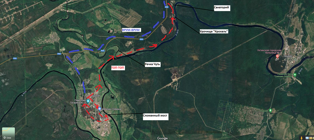 Тут оказалось, что проклятые Байден с Обамой очень сильно подставили меня. На google maps в этом месте был обозначен мост через Ухту, а на самом деле он выглядит так.