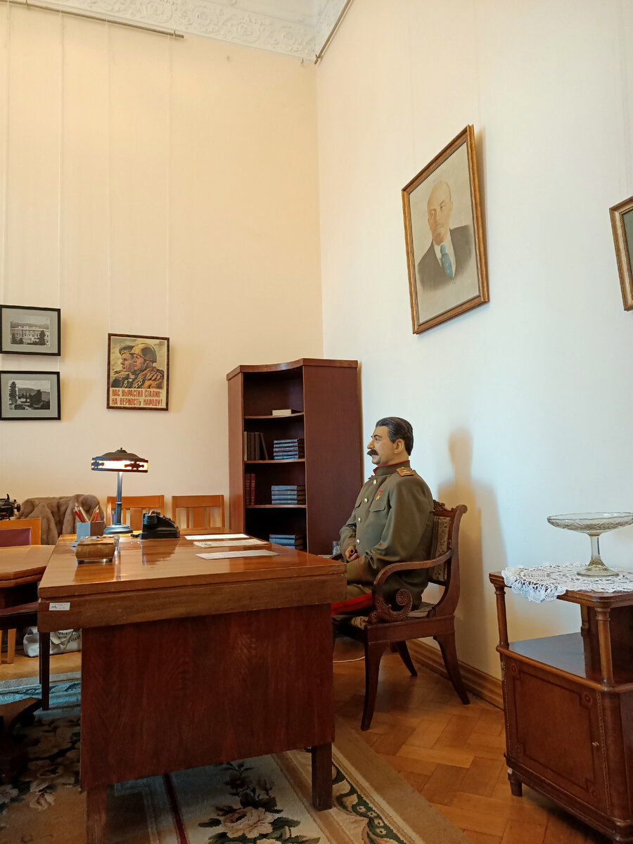 Есть в Ливадийском дворце кроме основной экспозиции ещё одна! Сталин в Ливадии и Царский солярий Назвать это экспозицией я не могу, хотя посетителям говорят, что выставка «Сталин в Ливадии» посвящена отдыху Иосифа Виссарионовича Сталина в Ливадии, с конца марта 1945 года Ливадия использовалась в качестве государственной дачи, и Иосиф Виссарионович побывал в дворце дважды. Что же это за экспозиция? Небольшая комната, где Сталин сидит за рабочим столом с парой документов. Комната обставлена в соответствии с временем и пожеланиями её хозяина. Экскурсии нет, но показывают четырёхминутный фильм о Ялтинской конференции. После осмотра комнаты надо по лестнице, которая идёт вокруг лифтовой шахты подняться на крышу в «Царский солярий», то есть на смотровую площадку, где императорская семья Николая II отдыхала, принимала воздушные ванны, наслаждалась видом на Ялтинскую бухту и парк. А виды там действительно изумительные! Стоит это удовольствие 150 рублей! И именно подъём на крышу оправды
