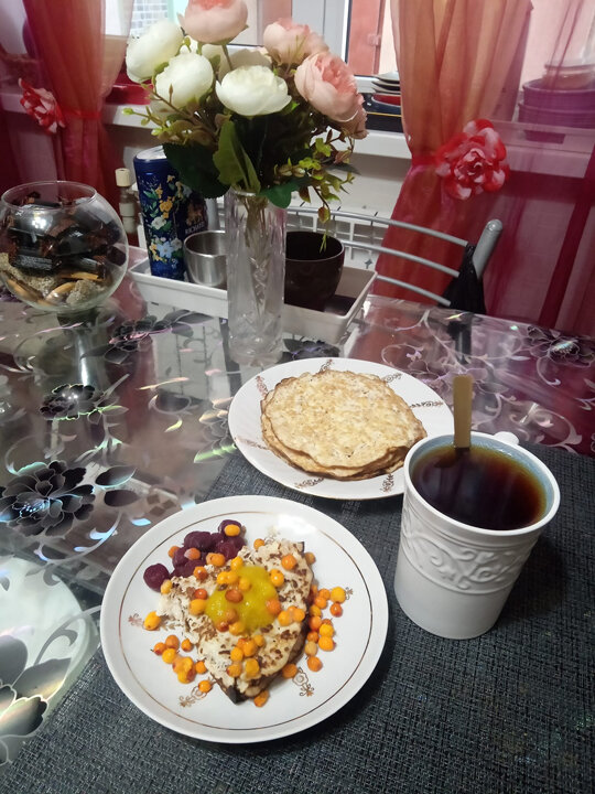 Осталась у меня вчерашняя каша ячневая. Куда ее применить,.. Вспомнила, как бабуля пекла блины с пшенной кашей. Решила рецептик «под себя» подредактировать. Взяла оставшийся сыр Рикотта (200 г).,4 яйца крупных, по 0,5. ч.л. соды и соли,1 мерную ложку сахзама (фитпарад), люблю, чтобы не очень сладко. Всё хорошо перемешала венчиком, разогрела в микроволновке оставшуюся отварную ячку, добавила её, перемешала всё хорошо и выпекала на смазанной топленым маслом блиннице. Блинчики хорошо переворачивались и получились пышными и вкусными с ягодами и лимонным джемом. Сейчас ближе к весне стала заваривать шиповник по утрам и пить витамины для диабетиков. Готовимся к весне! + 2 фото Больше общения и рецептов - в группе "Рецепты для диабетиков" в ВКонтакте! Рецепт на странице Автор рецепта - Марина Лобастова