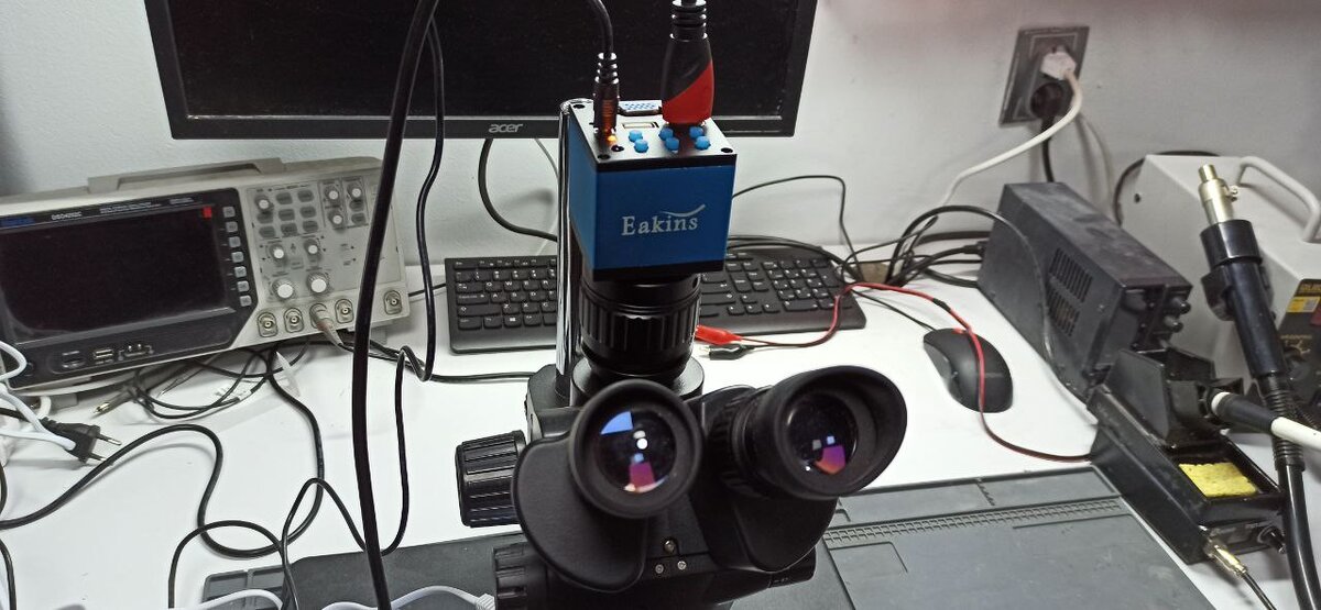 Не прошло и года, как я смог найти в себе силы и желание потратится на камеру для микроскопа. Приобрел сначала микроскоп, он мне обошелся в районе 22х тысяч рублей. Через пол года, когда я активно начал снимать видео, поймал себя на мысли что пора приобрести и камеру для красивого подсъема. Заказал в том же китайском магазине, где приобретал сам микроскоп. Обошлась в райне 8 тысяч рублей. По приходу камеру не смог ее просто установить в микроскоп, нужен был переходник. Немного поразмыслив, посовещался с мастерами, и написав продавцу пришел к выводу, что пора заказывать переходник, который называется C-mount. Заказал и вуаля, наконецто все срослось!) Я могу тестировать камеру. Для начало вывел изображение с платы телевизора LG. Качество картинки порадовало. Сигнал с камеры по HDMI подал на телевизор Samsung, свежеотремонтированный и ожидающий своего хозяина. Так же можно записывать видео на USB флешку. Ну и на последок посмотрим на светодиод LG. Камерой я доволен, собираюсь в ближайшем