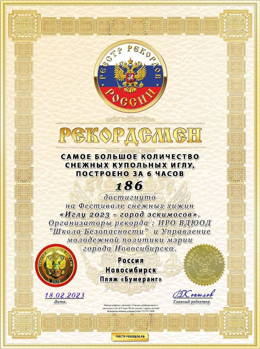 Новосибирский Фестиваль снежных хижин «Иглу – 2023 Город эскимосов», прошедший на пляже «Бумеранг» попал в Реестр рекордов России. В этом году участие в нем приняли более двух тысяч человек, которые за несколько часов построили рекордное количество хижин из снега. О рекорде фестиваля иглу 2023 года сообщила в ТГ-канале вице-мэр Новосибирска Анна Терешкова. Столица Сибири стала рекордсменом по количеству снежных купольных иглу. За 6 часов было построено 186 снежных хижин. Строгое жюри весьма серьезно подходило к оценке конкурсных сооружений. Проверялась высота, диаметр, быстрота и аккуратность постройки иглу. Хорошим эскимосским домом считалось идеально ровное сооружение без щелей и зазоров, в которое легко мог войти член жюри. По окончании строительства снежных хижин многие остались в «Ночном городе эскимосов», чтобы насладиться плодами своих трудов в виде подсвеченных иглу, а также этнической музыкой северных народов, и сделать красивые фотографии. А самые подготовленные и храбрые реш