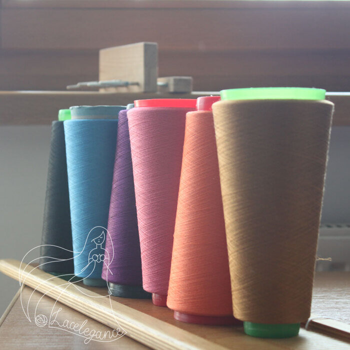 Когда магазин пряжи предлагает шикарный артикул в нескольких цветах, хочется взять их все и побольше. Встречайте: Wudi от Loro Piana - 85% шелк, 15% кашемир. Нитка очень тонкая - 7000м/100г. Чтобы из нее можно было вязать, ее нужно сложить в 17-18 раз. Я буду ткать, поэтому ограничусь десятью сложениями. Итак, в каждой бобине по 7 км пряжи, всего 42 километра, все эти километры надо разделить на 30 равных частей. Проработав целый день мотальщицей, получила по 5 клубков каждого цвета, в 5 сложений толщина нити становится 1400м/100г. При заправке станка через каждый слот и глазок протягиваю двойную нить, поэтому итоговая нить основы 700м/100г. Изначально использовала бердо 40/10, но ткань оказалась слишком рыхлой, поэтому перезаправила станок с бердо 60/10. На полях замечу, что бердо 60/10 у меня не деревянное, а полиэтиленовое сборное от Ashford. Пластик в нем мягкий, крайние ламели у каждого сегмента гнутся. Если бы все бердо было хотя бы цельнолитое, а не нарезанное на куски, пластик