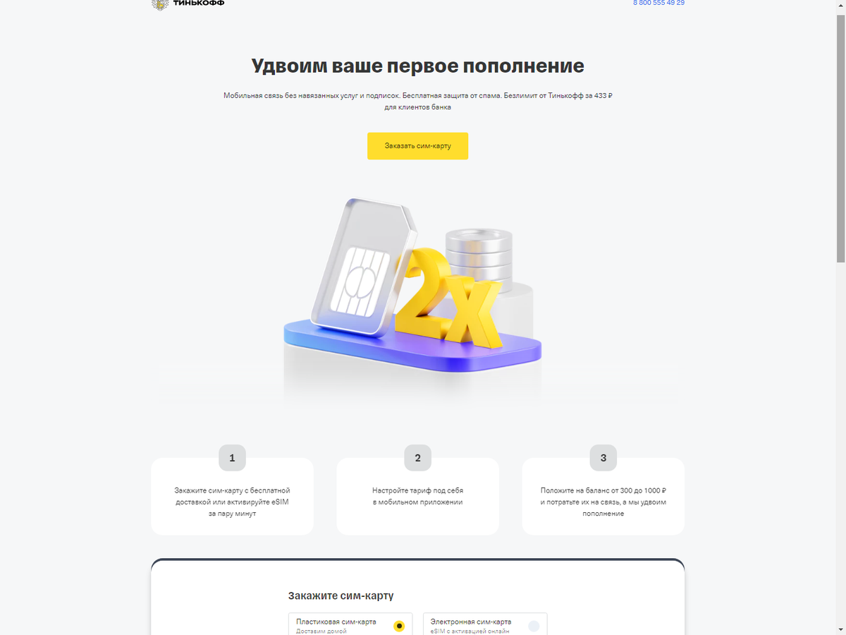 ОФОРМИТЬ СИМКАТУ ОНЛАЙ БЕСПЛАТНО(ТЫК) до 1000 ₽ублей на связь Тинькофф (при полнения 1000 руб. И ТРАТ в 1 месяц) + первые 7 дней 25 ГБ ИНТЕРНЕТ и 600 минут Бесплатно ОФОРМИТЕ 2023 Г. + Бесплатна доставка СИМ КАРТУ или Электронная сим-карта eSIM с активацией онлайн Месяц связи в подарок - Введите промокод MOBILEFREE при заказе симки и получите 30 дней связи бесплатно. ОФОРМИТЬ СИМКАТУ ОНЛАЙ БЕСПЛАТНО(ТЫК) или Акция "bonusx2"! ПРОМОКОД Акция действует бессрочно. Условия акции: Акция действует только для новых клиентов Тинькофф Мобайл, которые оформили заявку на акционном лендинге! Акция «Пополняйте баланс бонусными баллами и милями» Акция действует бессрочно. Как оплатить связь баллами и милями: Скидка на связь за перенос номера 1200 минут бесплатно и гигабайты со скидкой 30% на три месяца. Перенесем номер за восемь дней. Соберите свой тариф для любых целей Выберите удобный пакет минут и гигабайтов, подключите безлимитные соцсети, мессенджеры, музыку и видео.