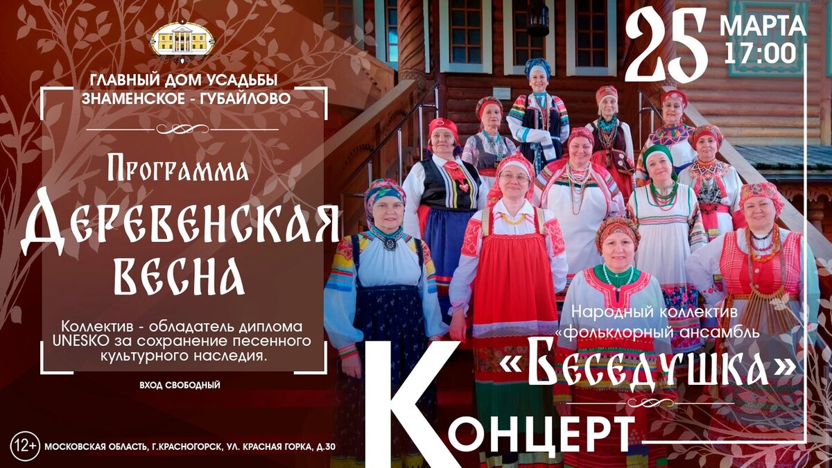 В усадьбе «Знаменское-Губайлово» 25 марта пройдет концертная программа Народного коллектива «Фольклорный ансамбль «Беседушка» под названием «Деревенская весна». «Беседушка» представит не только концерт в традиционном понимании, но и исполнит шутки, прибаутки, представит танцы, а руководитель коллектива Оксана Гладких еще и расскажет интересные истории о народной песне, культуре и традициях празднования различных дат. 25 марта православные чтут память преподобного Феофана Исповедника, праздник называется Феофанов день. Жители с раннего утра разбрасывали по двору зерно для птиц, считая, что так быстрее придет хорошая погода. Концерт «Беседушки» начнется в 17:00.