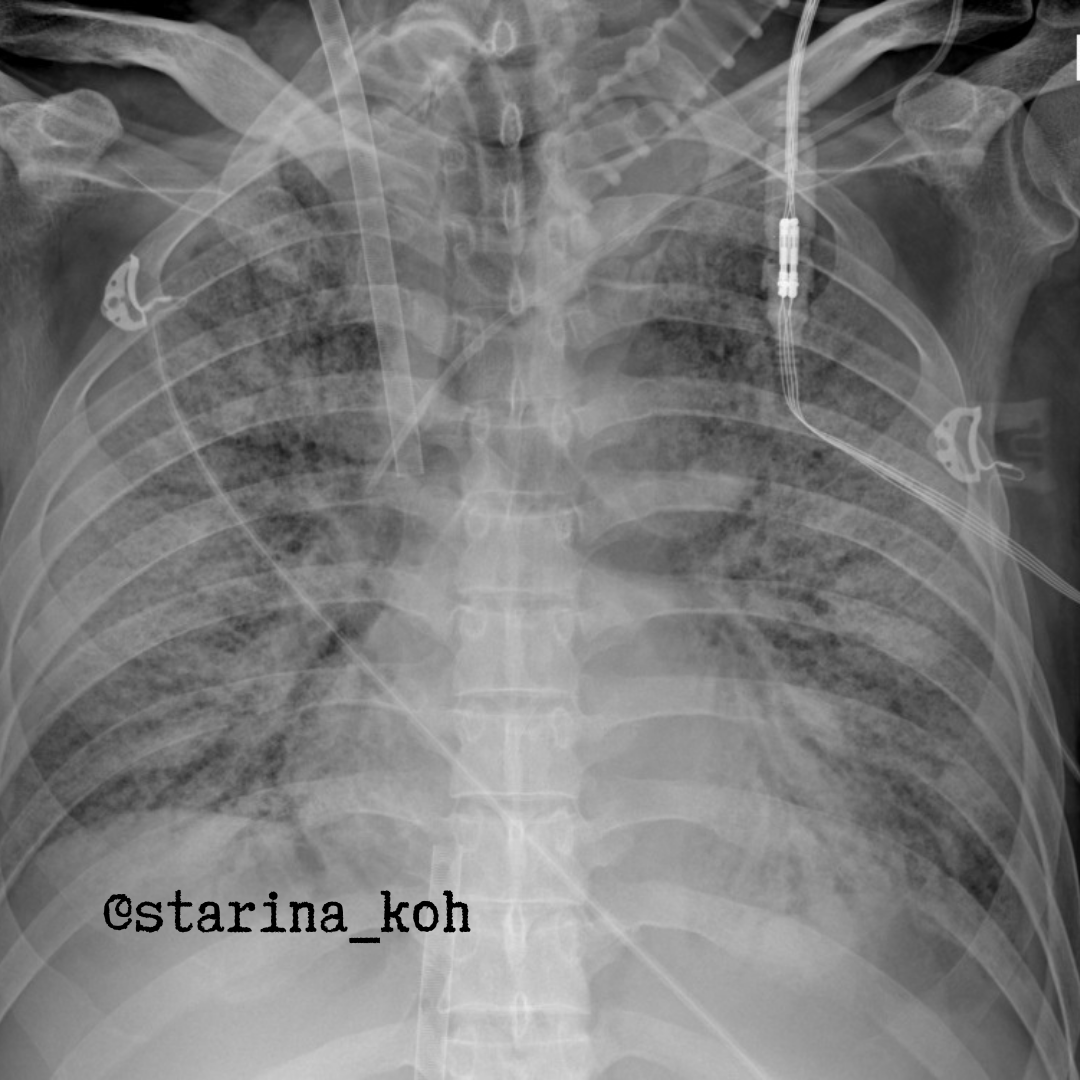 В настоящее время именно такой "идиопатический ОРДС" носит название синдрома Хаммана-Рича. В определенный момент этиологический фактор ОРДС уже не столь важен - т.к. от большинства вирусов не существует этиологической терапии, поэтому приходится коррелировать следствия в виде подавления избыточной иммунной реакции и поддерживать адекватную оксигенацию. Т.к. у данного пациента не удалось достигнуть адекватных параметров оксигенации путем ИВЛ, в т.ч. в прон-позиции, пациент был переведен в специальный центр ЭКМО, где и была инициирована VV-ЭКМО - вы можете видеть характерную постановку канюлей на рентгеновском снимке.