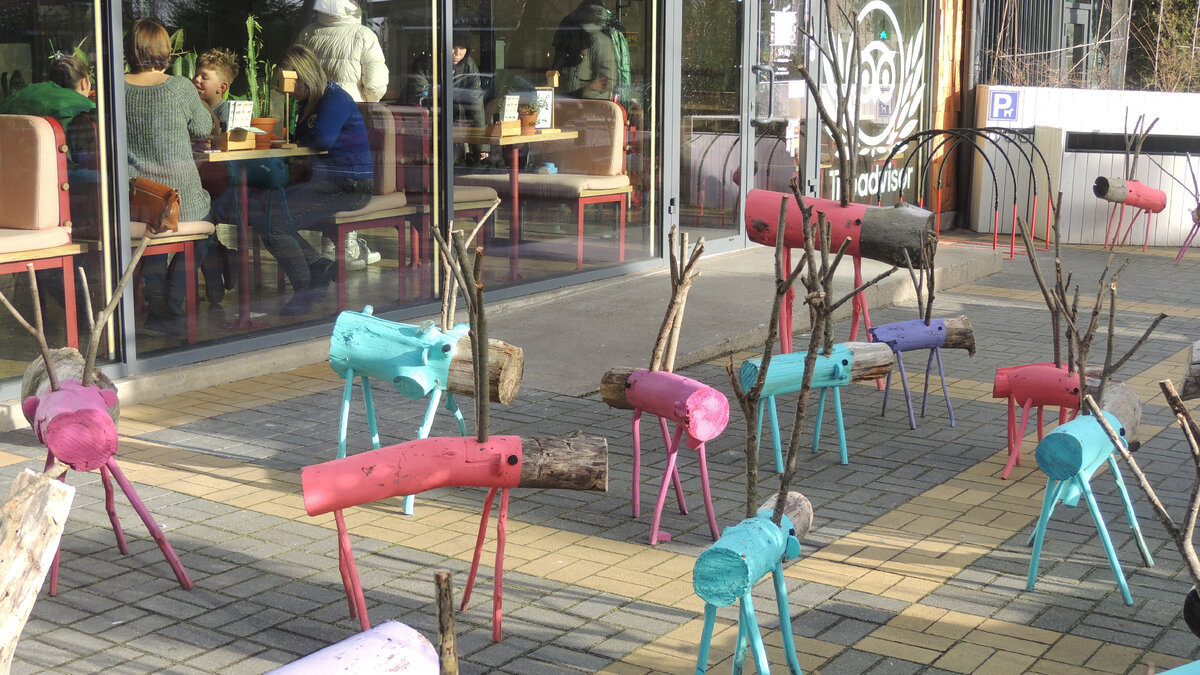 В любом случае поездка к морю - это прекрасно, в любую погоду оно манит к себе, ведь правде? Итак, мы в Зеленоградске, быстрым шагом идём на променад... Ветер в лицо заставляет прятать щеки в шарф, а народ в кафе греется, глядя на таких чудесных оленей...