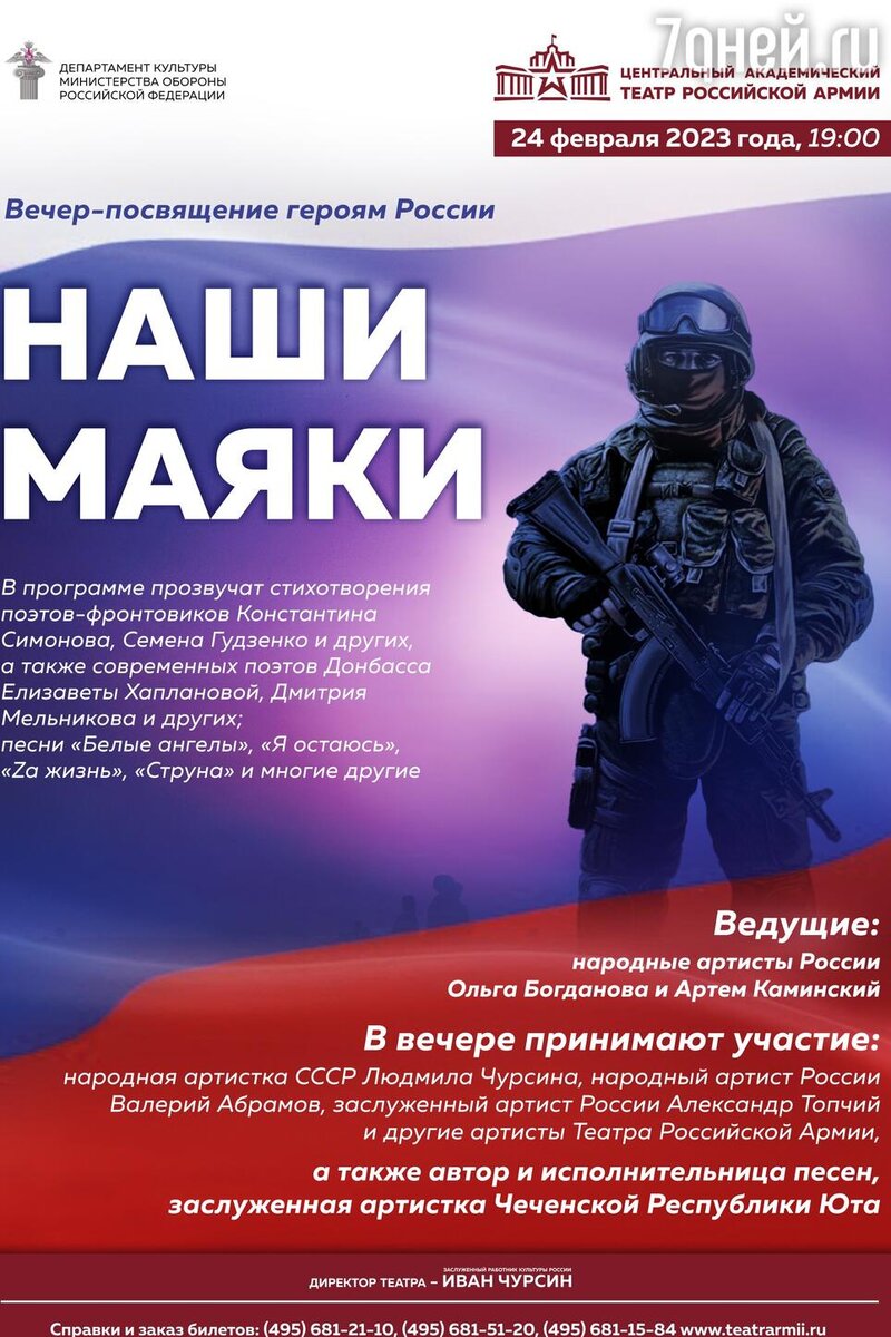 24 февраля 2023 года в 19.00 на Большой сцене Центрального академического театра Российской Армии состоится вечер-посвящение Героям России «Наши маяки».