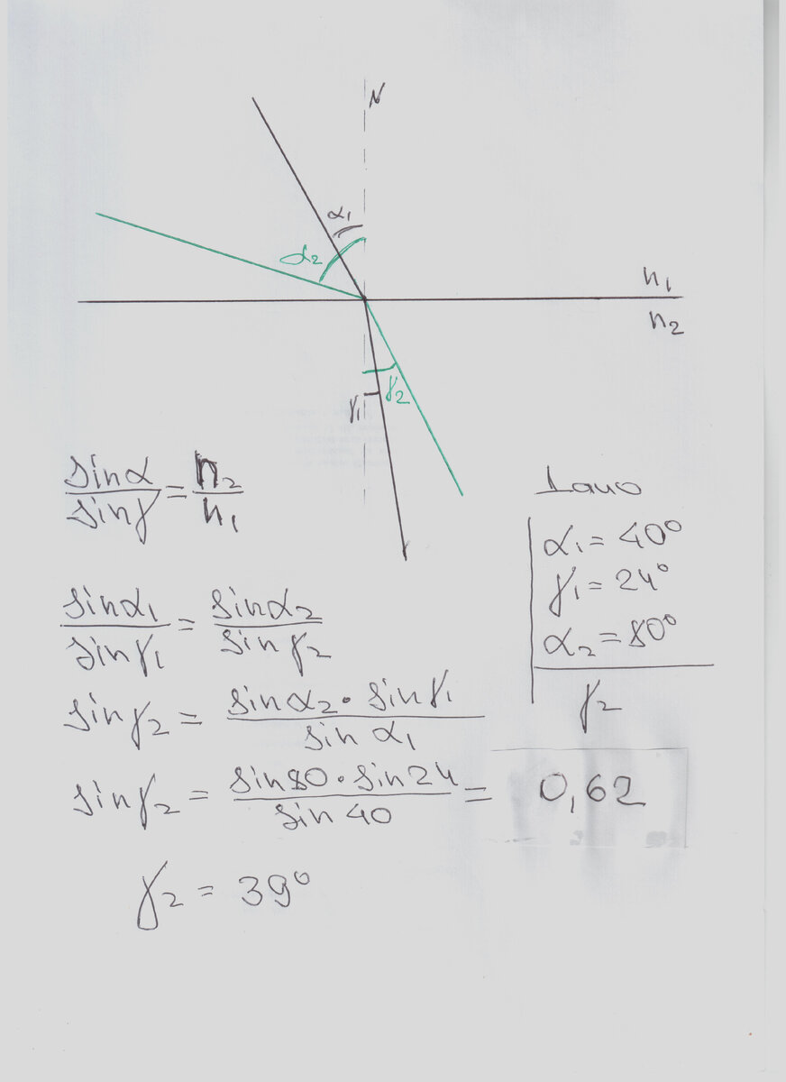 Задача: Тонкий пучок света направлен в воздухе на поверхность некоторой жидкости под углом падения 40 градусов. Угол преломления равен 24 градуса. Каков будет угол преломления при угле падения 80 градусов? Решение: Согласно законов преломления света, мы знаем что отношение синуса угла падения к синусу угла преломления равно соотношению относительного показателя преломления второй среды по отношению к первой. Поскольку у нас меняется угол падения и преломления в той же самой среде, соответственно отношения синуса угла падения к углу преломления в первом случае, будет равно отношению синуса угла падения к синусу угла преломления во втором случае. Приравниваем, вычисляем. Задача решена. Хотите больше задач? Подписывайтесь на канал, ставьте лайки, пишите комментарии. Предлагайте варианты задач, обязательно со ссылкой на источник.