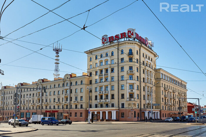 Продолжаем показывать вам квартиры с редкими балконами в центре Минска. Недавно была двушка на Первомайской и трешка над «Караваем». Сегодня — двухкомнатная сталинка на Независимости, 39, прямо у входа в метро на станции «Площадь Победы». Это восьмиэтажное здание 1950 года постройки, стоит на пересечении проспекта Машерова и Независимости. Сверху на нем вывеска банка BSB, а внизу — книжный магазин OZ.by, Сбербанк и парикмахерская. Квартира находится на втором этаже. Общая площадь — 68,7 «квадрата». Жилая площадь занимает 40 квадратных метров. Изолированная кухня — 9,2 «квадрата». На полу в кухне лежит плитка. Комната прямоугольной формы, а кухонный гарнитур около двух параллельных стен. Плита газовая. Есть духовка, вытяжка и микроволновка, на стене висит телевизор. В кухне французские окна и выход на балкон. С балкона открывается вид на проспект Независимости и улицу Козлова. Сам балкон выглядит вот так. В гостиной на стенах обои. Висит спортивный турник для подтягивания. Стоит диван и