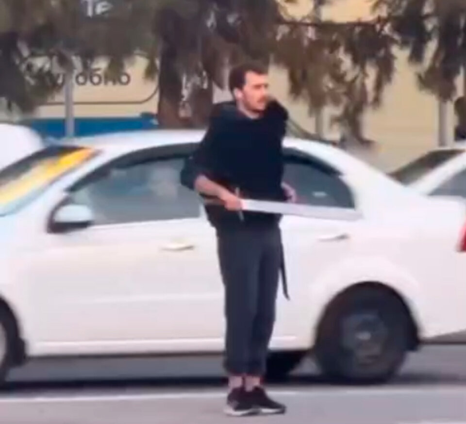 Мужчина на воображаемом коне и с мечом в руках проскакал по улице в Ташкенте. Видео