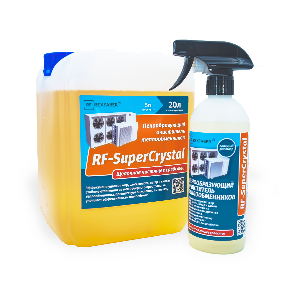 RF-SuperCrystal создан по уникальной формуле на щелочной основе с добавлением активных компонентов, в результате работы которых мощное пенообразование беспрепятственно и оперативно справляется с широким спектром загрязнений. Активно удаляет жир, сажу, копыть, нагар - самые стойкие затвердевшие отложения из межреберного пространства конденсатора. Состав после чистки не причиняет вреда змеевику, оставляет его до блеска чистым, предотвращает окисление змеевиков. Использовать SuperCrystal достаточно легко и просто. Включаем оборудование, разводим в соотношении 1:3 и наносим на загрязненный участок распылителем низкого давления и оставляем на 5 минут. Эффективность очищения возрастет, если поверхность змеевика будет теплой. После чего смываем водой.