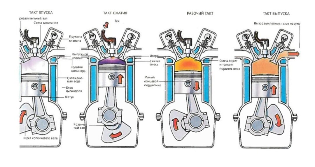 Но это только принцип работы с пояснением на простых составляющих. На деле же процесс выглядит несколько сложнее, ведь надо же вначале обеспечить поступление смеси в цилиндр, сжать ее для лучшего воспламенения, а также вывести продукты горения. Эти действия получили название тактов.