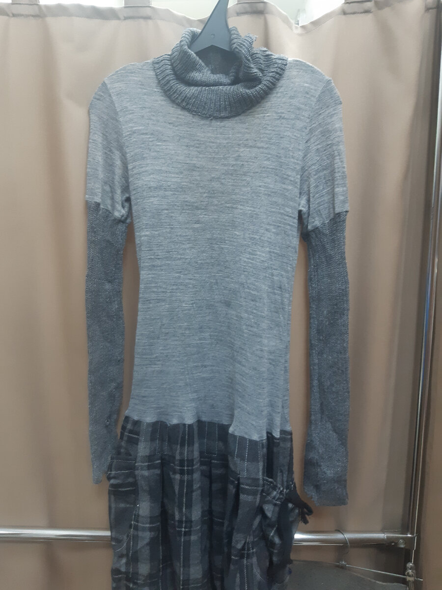 Попалось платье из трикотажа разной фактуры от бренда 2026. Понравилось, как характеризуют бренд в интернете -готический футуризм, по мне, так очень близко к истине). Горловина и рукава из 70% акрила и 30% шерсти, более темная пряжа с выраженным рисунком, туловище и рукава по плечи из 62% шерсти и 38% вискозы из более светлого и гладкого трикотажа, юбка с очень интересными карманами на завязочках из 100% толстого акрила в клеточку. Сделано во Франции- редкость при нынешнем вездесущем Китае. 480руб. Платье джинсово-синего цвета от Naketano, плотная толстая ткань из 65% хлопка, 35% полиэстера. Украшено аккуратной вышивкой волка и эмблемой бренда внизу платья и на подоле. Складки на юбке красиво обрисовывают бедра и складываются в карманы. Удобное спортивное платье за 610 рублей. #секондхенд