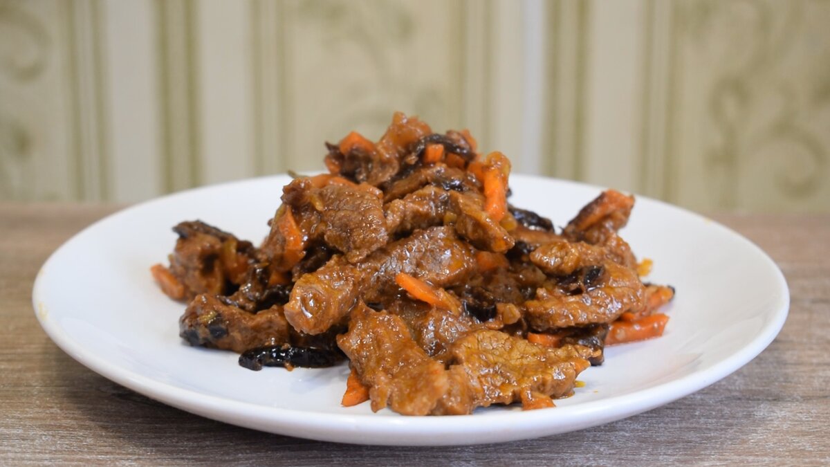 Говядину 700 гр режем на небольшие брусочки и обжариваем на растительном масле 8 минут. К говядине добавить 2 ст.л. томатной пасты, 300 мл воды, черный перец и лавровый лист. Тушим под крышкой 30 минут. Две луковицы режем полукольцами и одну морковь брусочками. Обжариваем на растительном масле до мягкости лука. Добавляем в говядину обжаренные овощи, мелко нарезанный чернослив 50 гр и три зубчика чеснока через пресс. Соль 1 ч.л. и сахар 1 ч.л. так же добавим , перемешиваем и тушим под крышкой 8 минут. Подаем к ужину с хлебом. Приятного аппетита! Кстати, я ранее уже делился этим рецептом на своём канале, переходите и смотрите. Так же рекомендую посмотреть: В последнее время стал чаще покупать самую дешевую говядину: показываю, что из неё готовлю вместо ужина (делюсь рецептом салата) Рецепт: