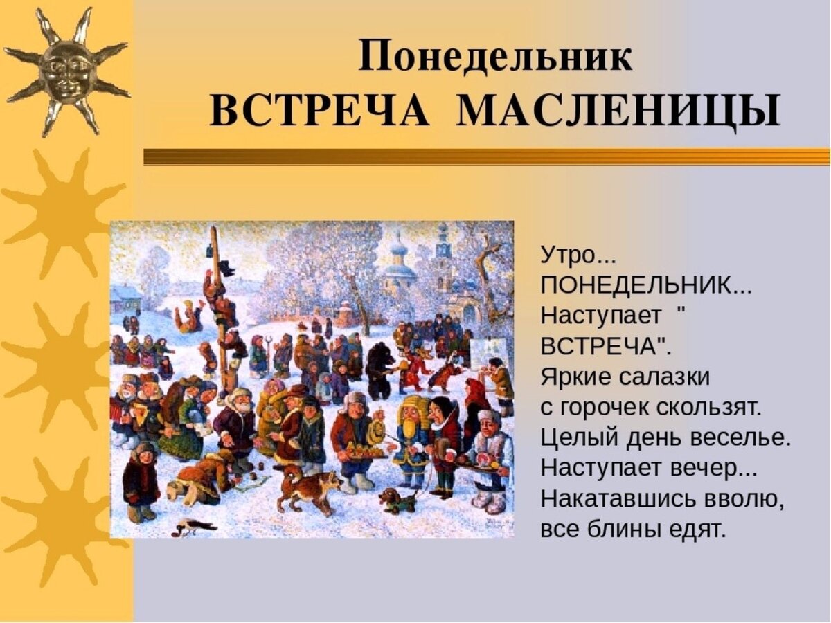 Раньше жили большими семьями, девушка переселялась в дом мужа. В первое утро Сырной седмицы свекры (родители мужа) отправляли жен своих сыновей в гости к родителям, а вечером и сами навещали родню. Главным было — сватов не обидеть и накормить их как следует 🍽 В понедельник на площадях достраивали развлечения для народа — устанавливали качели, строили ледяные горки и снежные крепости. ❄️ Главный обычай масленичного понедельника — выпекание первого блина. Его не ели, а отдавали неимущим, чтобы те помянули души усопших родственников. Сходите в гости к родителям, они будут рады ☺️ Previously, they lived in large families, the girl moved to her husband's house. On the first morning of Cheese Week, father-in-laws (parents of the husband) sent their sons' wives to visit their parents, and in the evening they themselves visited relatives. The main thing was not to offend the matchmakers and feed them properly 🍽 On Monday, entertainment for the people was completed on the squares - swings w