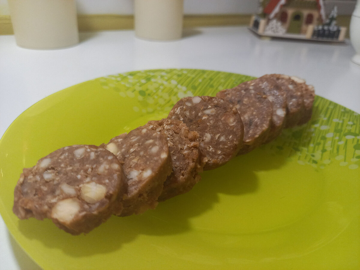 ШОКОЛАДНАЯ КОЛБАСКА БЕЗ САХАРА Этот замечательный рецепт я нашла в интернете, прекрасный состав и волшебный вкус. Очень удобно сделать и положить колбаски в морозилку. Перед тем, как налить чай, достаньте, порежьте ее на кружочки, пленка мгновенно отходит. Первое, что нужно сделать, ОТЛОЖИТЬ 1/3 орехов.(Не забудьте!) Они нам понадобятся в конце. 1 ЭТАП: В блендере измельчаю: -овсянка 100грамм -кешью 150грамм -миндаль 150грамм (вы можете взять любые орехи) Не забудьте, что мы откладываем 1/3 орехов в сторону. всего орехов 300грамм, отложить-100грамм. (можно на глаз) 2 ЭТАП: В блендере измельчаю: -финики 200гр (МЯГКИЕ!!!)(достаем косточки из фиников!) -вода 60грамм -кокосовое масло 120грамм -сироп топинамбура (я добавила 2столовые ложки) -какао 3 столовые ложки 3 ЭТАП: 1/3 часть орехов НЕМНОГО измельчаем в блендере! вот так: Все смешиваем и делаем колбаски. У меня получились вот такие, вы можете сделать другие, можете 3 больших. сразу кладите их в морозилку) через 20мин можете д