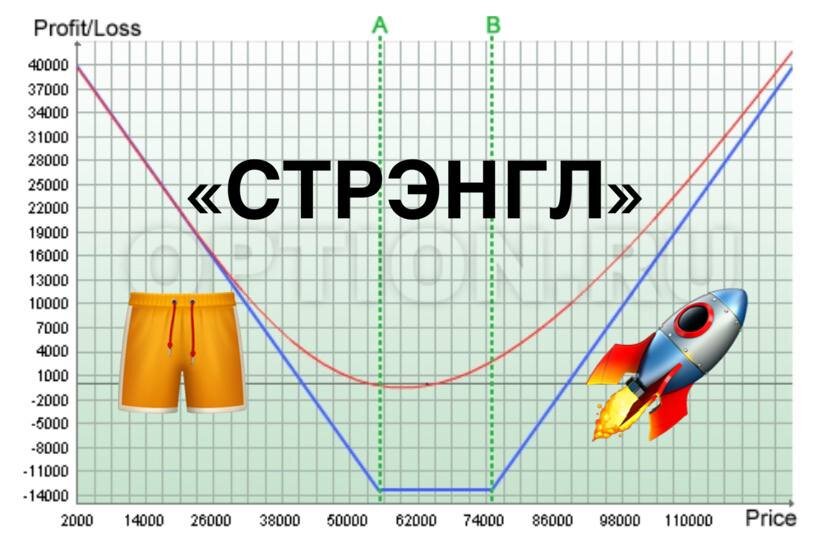 Такую возможность даёт опционная стратегия СТРЭНГЛ, она заключается в одновременной покупки опционов CALL и PUT на разных страйках вне денег.
