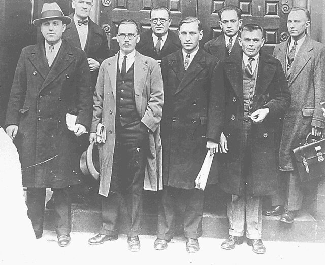 В Торонто бастовали канадские рабочие под руководством будущего лидера компартии Канады Тима Бака, а в Виннипеге заводилами были красные хохлы, под руководством украинского коммуниста из Квебека Джона Бойчука (на фото: Тим Бак стоит справа с портфелем, рядом с ним, первый справа в нижнем ряду, Джон Бойчук).