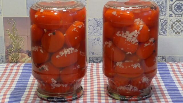 Этот вариант заготовки также носит красивое название «Помидоры в снегу». Количество чеснока в данном рецепте не большое, но вы можете добавить еще, если хотите, чтобы закуска получилась более пряная и острая. 🔥 ЛУЧШЕЕ В ТЕЛЕГРАМ: ПОСМОТРЕТЬ Ингредиенты на 1 литровую банку: Маринад: Способ приготовления: Шаг 1. Промойте помидоры, зубчики чеснока натрите на мелкой терке, или пропустите через пресс. Шаг 2. Начните заполнять банки. На дно положите перец горошком и наполните тару помидорами. Шаг 3. Залейте банки горячей водой и оставьте прогреваться на 20 минут. По истечению времени слейте из банок воду в кастрюлю. На этой же воде приготовьте маринад. Шаг 4. Поставьте кастрюлю на огонь, добавьте соль и сахар. Доведите воду до кипения, и держите на огне еще 2 минуты. По истечении времени добавьте уксус. Шаг 5. Разложите по банкам мелко нарезанный чеснок и залейте помидоры кипящим маринадом до самого верха. Шаг 6. Закройте заготовки крышками и переверните вверх дном банки. Накройте полотенц