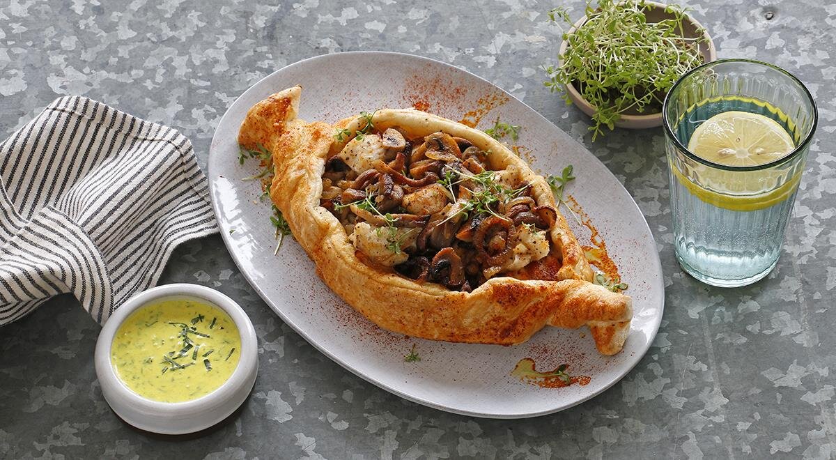 Не знаете, что приготовить из слоёного теста? Испеките открытый пирог с белой рыбой и грибами