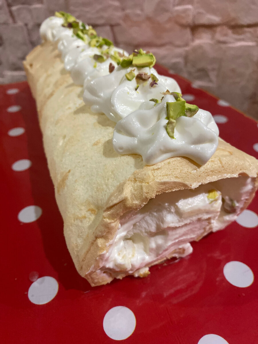 Яичный белок - 180 гр Кукурузный крахмал - 20 гр Эритрит (подсластитель) - 15 гр Рикотта - 70 гр Творожный сыр - 70 гр Мягкий творог 0% - 100 гр Подсластитель - 4-5 гр Мандарины очищенные - 150 гр Кукурузный крахмал - 15 гр Мандарины - 40 гр Фисташки -40 гр Белки взбить до мягких пиков, добавить подсластитель и крахмал, продолжить взбивать пока не образуется крепкая меренга (это когда чашу блендера переворачиваешь, а крем не вываливается из нее 😁). Распределить получившееся тесто на силиконизированный коврик/пергамент в форме прямоугольника и отправить в разогретую до 150 градусов духовку на 30-40 минут. Готовим крем: смешать мягкий творог, творожный сыр, рикотту и подсластитель. Готовим конфитюр: к мандаринам добавить немного воды и поварить на медленном огне 15 минут, добавить крахмал и подсластитель и потомить еще 5 минут. Дать остыть. На слегла остывшую меренгу намазать часть крема, сверху выложить конфитюр и закрутить рулетик , дать остыть. Сверху отсадить крем , с помощ