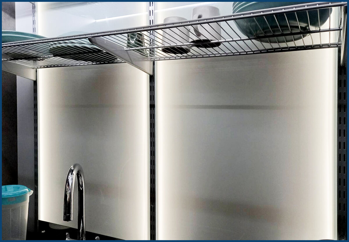 Чтобы было удобно впоследствии монтировать полки, мы совместили стекло со специальными профилями. В них уже были предусмотрены отверстия для установки полок. Таким образом, полки не только легко встали, но и появилась возможность регулировать их по высоте без каких-либо последствий для стекла.