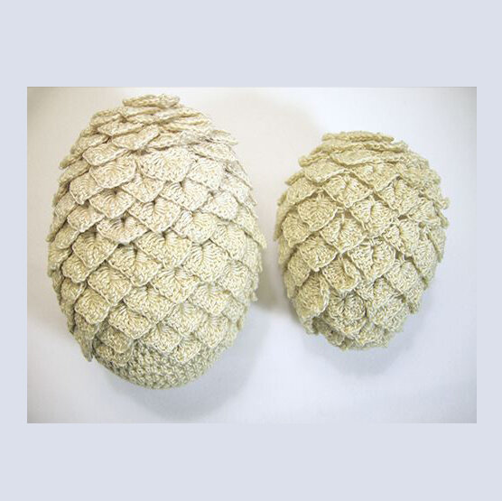 Если вы любите смотреть «Игры престолов», то вам наверняка понравятся вязаные яйца дракона, которые очень похожи на те, что держала в своих руках бурерождённая Дейенерис из дома Таргариенов. Яйца дракона связаны крючком узором «чешуйки» или «крокодиловая кожа», который удивительно подходит для того, чтобы отобразить фактуру яиц. Кстати, совсем недавно мы как раз говорили о том, как вязать узор «чешуйки», и если вы никогда не пробовали подобный приём вязания, то обязательно загляните в наш материал: