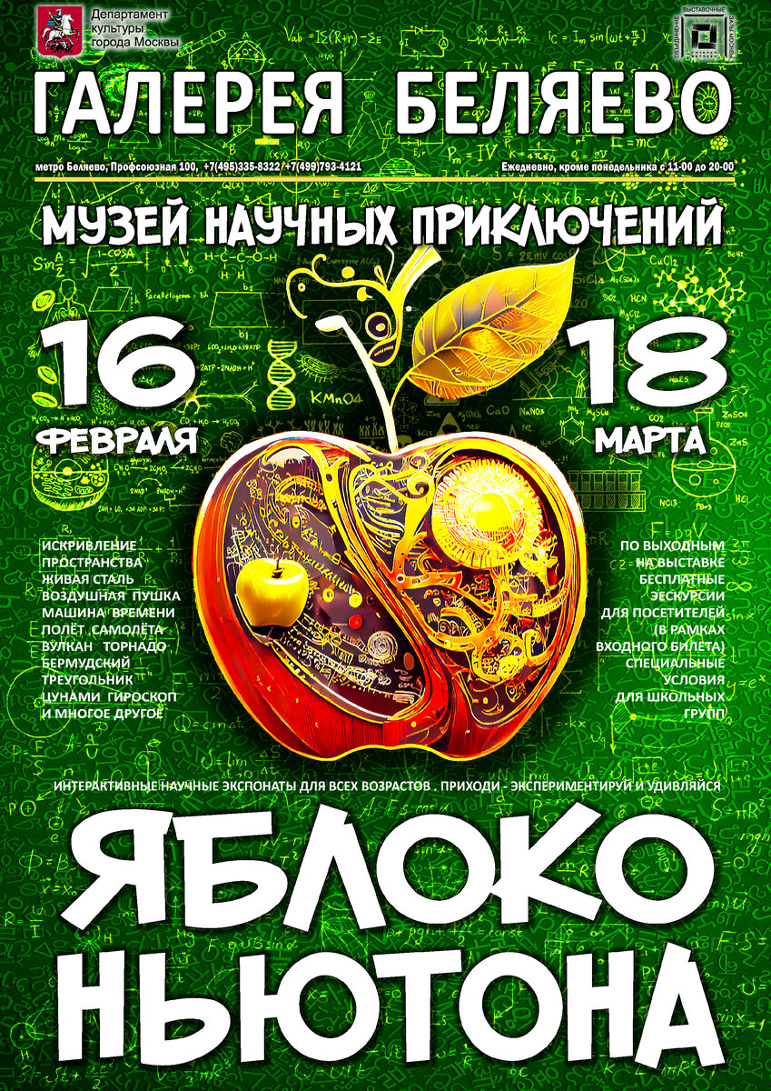 16 февраля 2023 года в Галерее Беляево Объединения «Выставочные залы Москвы» открылась интерактивная выставка «Яблоко Ньютона». На выставке представлена единственная в России коллекция арт-объектов, выполненных в виде научных экспонатов, рассказывающих о законах мироздания. 80 интерактивных экспонатов, связанных с именами величайших ученых, позволяют опытным путём вызвать торнадо, разобраться в причинах цунами или разбудить вулкан. Посетители выставки в лёгкой игровой форме изучат сложные природные и физические явления, получат возможность самостоятельно проводить опыты и эксперименты в области звука и света, познакомятся с законами механики, откроют завесу тайны стихий воды и воздуха. Уникальные авторские арт-объекты, представленные в экспозиции, не оставят никого равнодушным и не позволят бродить по экспозиции, скучая. Выставка «Яблоко Ньютона» – это большая экспериментальная площадка, где наглядно представлено действие природных явлений и физических законов. Все экспонаты для выстав