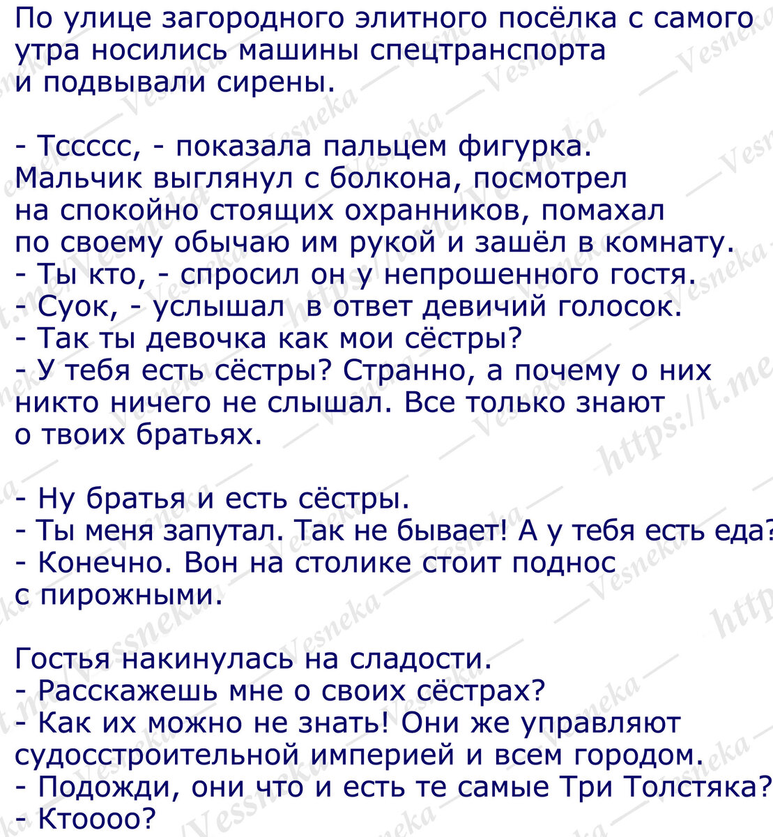 Сказочный привет всем! Наследник судостроительной империи "Слоняш" Тутти играл на балконе прекрасного загородного дома. Несмотря на серьёзную охрану, невесть откуда с крыши спрыгнула хрупкая фигурка, ловко приземлившись рядом с мальчиком. Тут и сказочки конец, а кто дочитал того люблю! В лесу на опушке Фея жила в избушке Уснувшая красота Ах Царевна Несмеяна, грустные глаза Свадебный подарок для Кикиморы Сотканная из стихов... Рыба Мечты Мистер Кулебяка Каша во Вселенной Три девицы со спицами Надеюсь Вам понравилось и вы поделитесь своим мнением в комментариях. Это помогает развитию канала и вдохновению автора. © 3 мая 2024 г. Vesneka Мила, фото автора Запрещается без разрешения автора цитирование, копирование как всего текста, так и какого-либо фрагмента данного рассказа, являющегося интеллектуальной собственностью автора. История сказочная, любые совпадения случайны. ПОДПИСКА НА МОЙ КАНАЛ Автор принимает с благодарностью любую помощь на своё лечение: https://yoomoney.ru/to/41001169047