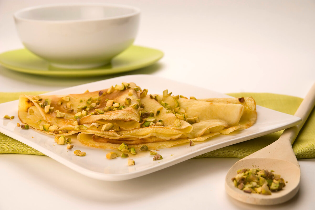 На Масленицу все мы готовим самые разные блины — кружевные, классические, с начинками и без… Но иногда хочется попробовать что-то новое. Поэтому предлагаем вашему вниманию рецепт блинов с фисташками, тем более что 26 февраля отмечают Всемирный день фисташек. Фисташки занимают особое место среди орехов благодаря содержанию огромного количества полезных элементов: магния, калия, лютеина, жирных кислот, которые помогают сжигать «плохой» холестерин… В древности фисташки называли «магическим орехом», их ценили высоко и считали признаком плодородия, богатства и достатка. Сегодня фисташковые деревья выращивают в Греции, Италии, Испании, США, Иране, Турции, в России найти их можно в Крыму и на Кавказе. Рассказываем, как сделать вкусные и необычные фисташковые блинчики. 📌Подписывайтесь на наш канал, чтобы сохранить все рецепты в одном месте! ☝️Вам понадобится: ∙мука — 200 гр •молоко — 400 мл ∙яйца крупные — 3 шт. ∙сахар — 50 гр.+2 ст. л ∙фисташки несоленые (очищенные) — 50 гр ∙миндаль — 10 гр