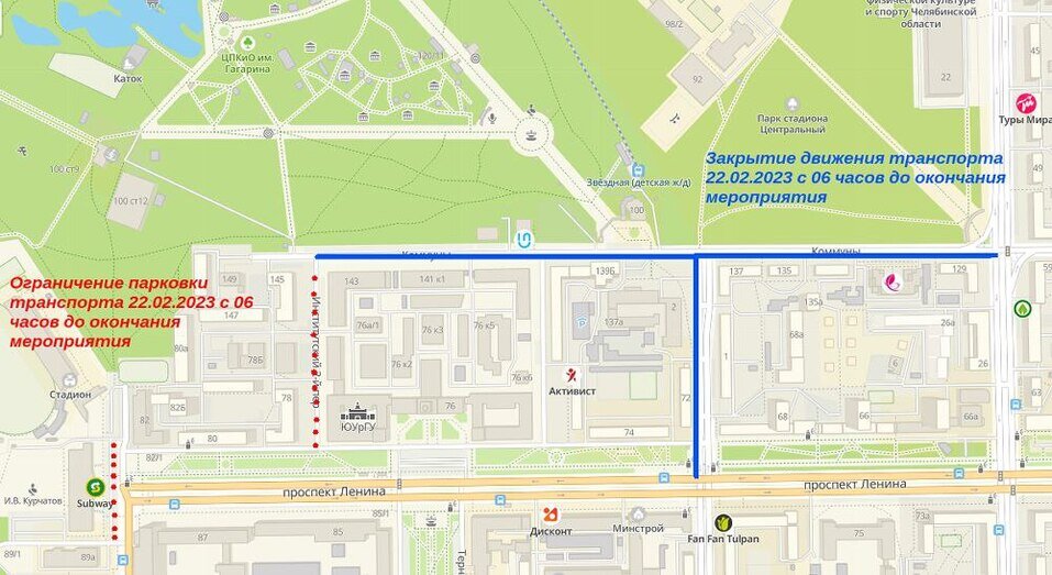 22 февраля в челябинском Парке Гагарина пройдёт патриотический митинг-концерт «Слава защитникам Отечества». Мероприятие стартует в 15:00, однако обеспечить безопасность его участников организаторы решили заблаговременно, и уже в 6:00 для автомобилей будут закрыты улица Коммуны от Энгельса до 2-го Институтского переулка и улица Энтузиастов от Коммуны до проспекта Ленина. Ограничения продлятся до окончания концерта; также в это время будет закрыт въезд на парковки у памятника Курчатову и на 2-м Институтском переулке. Отметим, что в праздничном мероприятии примут участие не только «представители правоохранительных структур, военнослужащие, участники патриотических и ветеранских организаций» и чиновники всех уровней. Хэдлайнером концерта должен стать экс-солист группы «Агата Кристи» Вадим Самойлов, ныне вместе с некоторыми другими рок-звёздами регулярно гастролирующий в зоне боевых действий. Ранее на CHEL.DK.RU: Челябинский производитель начал выпускать химические нагреватели для военных