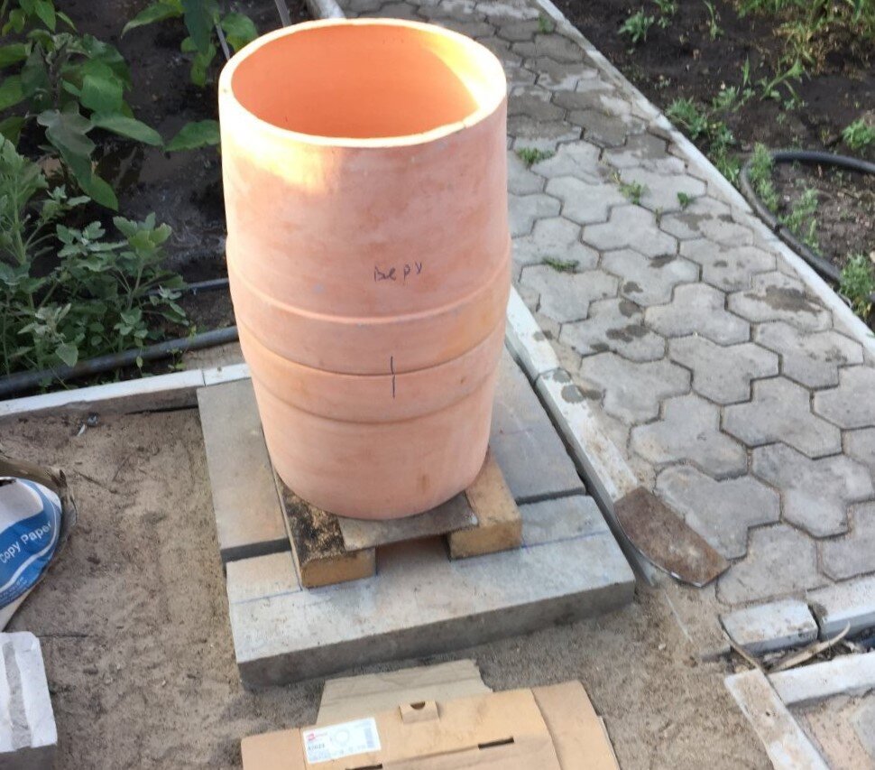 Пользователь FORUMHOUSE с ником sandrovich мечтал о тандыре. В один прекрасный день он забрёл в магазин и увидел большие цветочные горшки 39 х 32 см из керамики (терракота). Так родилась идея. Почему бы не «соединить» сосуды? В 2015 году такой горшок стоил 680 рублей. Процесс изготовления Форумчанин сделал «фундамент» из бордюров и шамотных кирпичей на песчаной подушке, на сухую срезал болгаркой с алмазным кругом днища горшков и поставил их друг на друга (печной герметик), чтобы образовался «кувшин». Обложил газоблоками — использовал специальный клей. Всё зашпаклевал, пропитал и покрасил. А в образовавшиеся пустоты между «тандыром» и облицовкой засыпал обычный песок. Почему? Автор полагает, что тепловые свойства песка почти такие же, как у глины. Высота тандыра — 60 см. Шампур и чашка внизу помещаются. Пользователь протопил печь с открытой крышкой — пока стенки не побелели и не выгорела сажа. Дрова участник портала выбрал берёзовые. Пора проводить испытания шашлыками! Посуду sandrovic