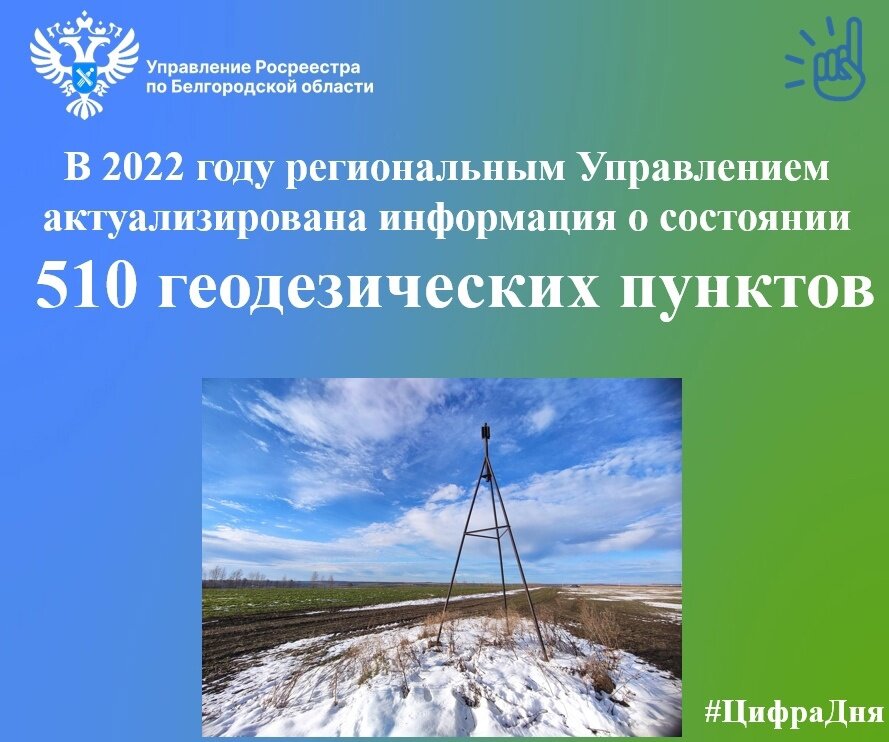 В рамках рубрики #ЦифраДня региональное Управление информирует, что в 2022 году по результатам обследования пунктов государственных геодезической и нивелирной сетей, в том числе с использованием высокоточного геодезического оборудования, должностными лицами Управления Росреестра по Белгородской области актуализирована информация о состоянии 510 геодезических пунктов.