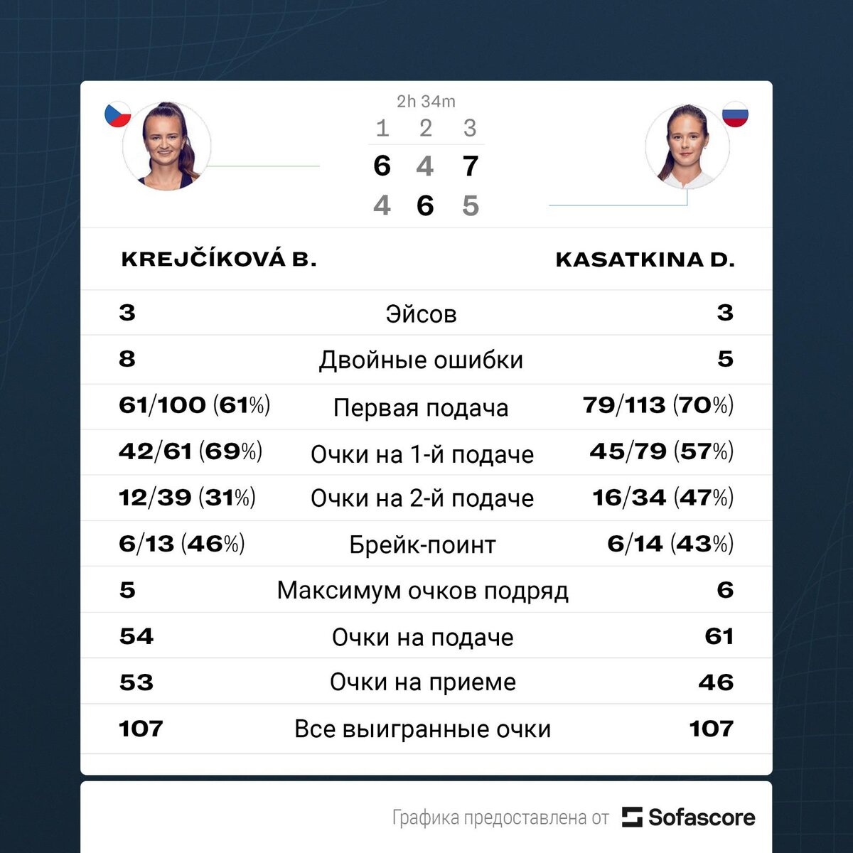 Первая ракетка России и восьмая ракетка мира Дарья Касаткина уступила чешке Барборе Крейчиковой (30) во втором круге турнира WTA-1000 в Дубае (ОАЭ), призовой фонд которого составляет почти $2,8 млн. Матч второго круга завершился со счетом 6:4, 4:6, 7:5. Теннисистки провели на корте 2 часа 34 минуты. Касаткина совершила три эйса, допустила пять двойных ошибок и реализовала шесть из 14 брейк-пойнтов. На счету Крейчиковой — три подачи навылет, восемь двойных ошибок и шесть реализованных из 12 брейк-пойнтов. Днем ранее вторая ракетка России Вероника Кудерметова (11) не смогла пробиться во второй круг турнира, уступив украинке Ангелине Калининой (33). Соперница Крейчиковой по третьему кругу определится в матче Юлии Путинцевой (Казахстан) и Петры Квитовой (Чехия). Победительница турнира в Дубае заработает $454 тыс. призовых и 900 рейтинговых очков.