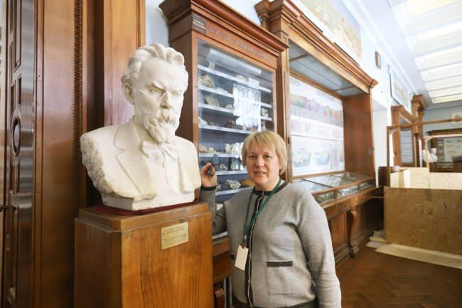 В главном корпусе МГУ находится Научно-учебный Музей землеведения. Он занимает верхние семь этажей здания, на которых располагаются музейные коллекции. НЕМНОГО ИСТОРИИ «Создан музей по решению совета министров СССР в 1950 году, но открыт был только в 1955 году. За это время преподавателями и студентами университета был собран природный материал, который составил основу нашей сегодняшней экспозиции», - рассказывает руководитель группы образовательных программ, доктор педагогических наук, кандидат биологических наук, выпускница факультета почвоведения Людмила Попова. В связи с ремонтом лифтов в главном здании МГУ, музей пока закрыт для массового посещения, но работа в его стенах не останавливается, как научная, так и учебная. Здесь проводятся занятия для студентов вуза. «Учатся у нас геологи, почвоведы, географы, биологи - в год около 2000 часов занятий проходит», - рассказывает Людмила Владимировна. Между тем, всем желающим доступны пока только онлайн-программы, которые можно найти на с