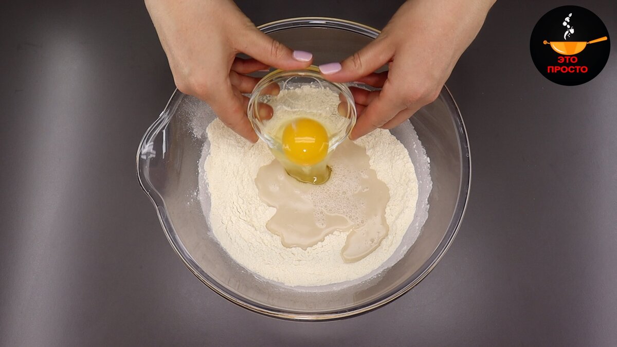 В другой ёмкости соединяем 5 г сухих дрожжей и 170 мл тёплой воды и выливаем в тесто. Также разбиваем 1 яйцо и начинаем замешивать тесто.