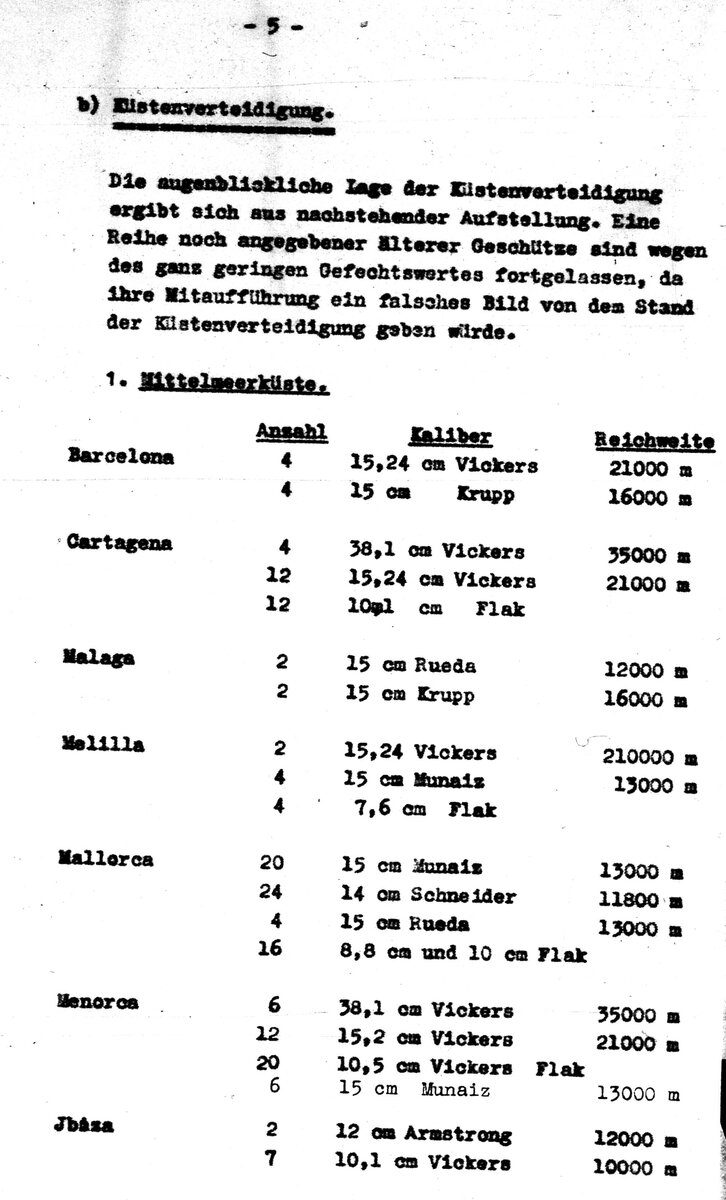 Вообще любопытно, когда из разных источников поступает документ в виде оригинала и его перевода. Именно в таком виде мне попали данные по береговой артиллерии Испании по состоянию на 1940 год. Для меня информация нужная, дающая часть информации по Гражданской войне в Испании (ибо береговая оборона не сильно изменилась в 1936 года. Думал, все будет просто и понятно, но первый же лист описания дал несколько заковыристых позиций. Итак... Барселона: -батарея 15,24-см береговых орудий Виккерса, образца 1915/24 года (4 шт., дальность стрельбы 21,6 км) Первая же позиция у нас встречается редко. Это не совсем Виккерс, это 152-мм/50 Vickers-Carraca — 152-миллиметровое корабельное орудие, разработанное для ВМС Испании английской компанией Vickers в 1915 году и выпускалось по лицензии «Артиллерийской мастерской Карраки» принадлежащей «Испанскому обществу военно-морского строительства» (SECN). Устанавливалось на легкие крейсера в одноорудийных и двухорудийных установках, а также использовалось