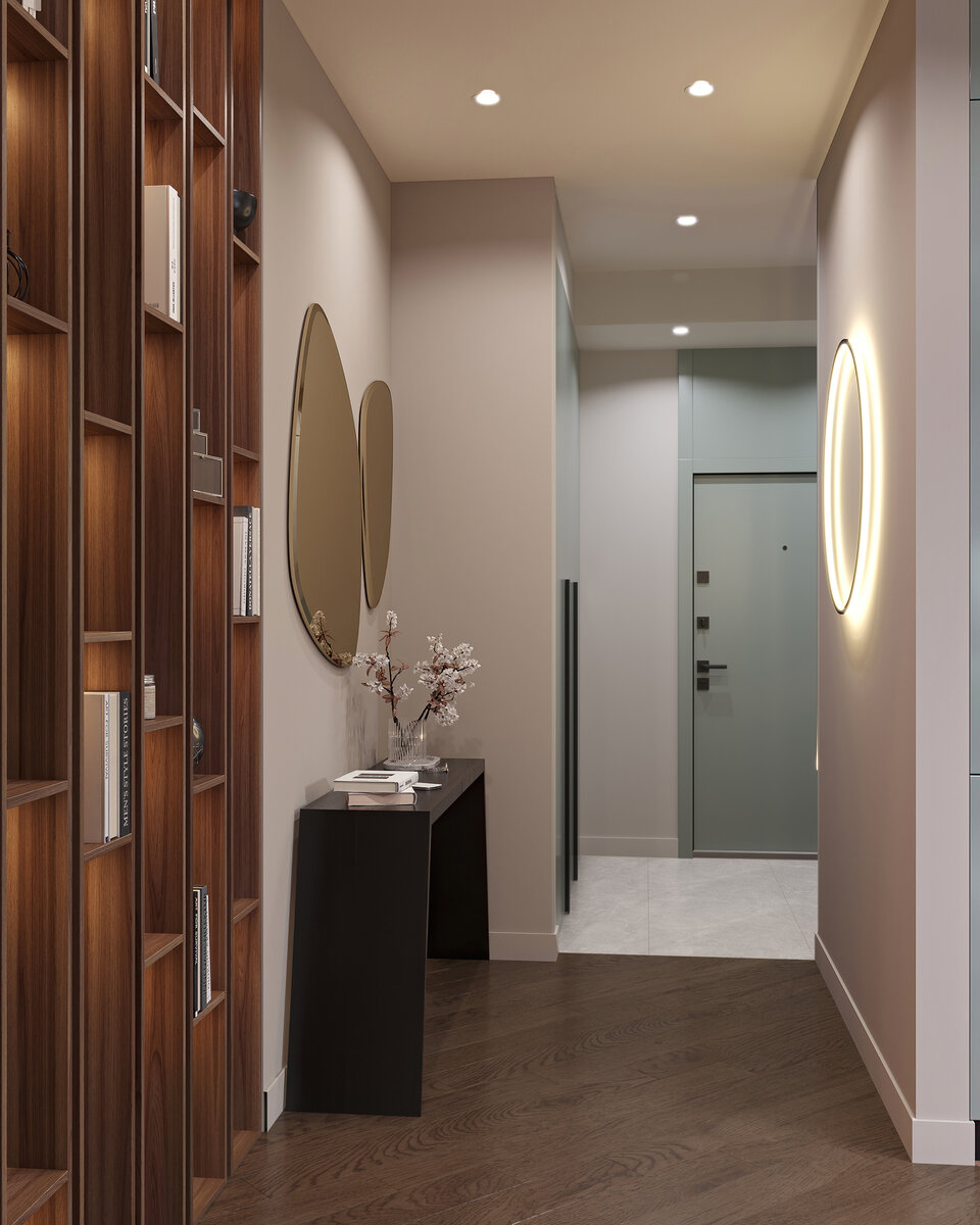 Каждый владелец квартиры или дома хочет видеть свой интерьер интересным, необычным и запоминающимся. Неудивительно, ведь интерьер – это отражение образа жизни человека, его интересов, увлечений. Существует много способов, которые позволят создать уникальное пространство. Это может быть и мебель, выполненная по индивидуальным эскизам, и винтажные предметы, архитектурные конструкции и т.д. В квартире в ЖК Крылья мы сделали интерьер особенным с помощью зеркал. Уже на входе в квартиру, в прихожей, гостей и хозяйку встречает зеркало, которое преображает интерьер, делая его не типовым. В коридоре также разместились зеркала, в которых отражается светильник, что визуально увеличивает пространство. В спальне зеркало стало одним из главных акцентов, привлекающей внимание. Мы создали конструкцию, из зеркала и красивого полукруга, в центре которого разместили красивое бра. Такой прием позволил решить сразу 3 важных момента. Во-первых, зеркало у окна делает помещение зрительно больше и легче, плюс
