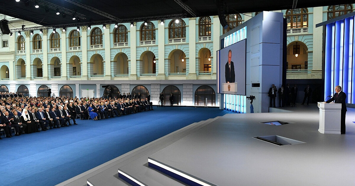 Выступал президент перед Федеральным собранием в московском Гостином дворе. Трибуна стояла далеко, но Путина крупно показывали на экранах.