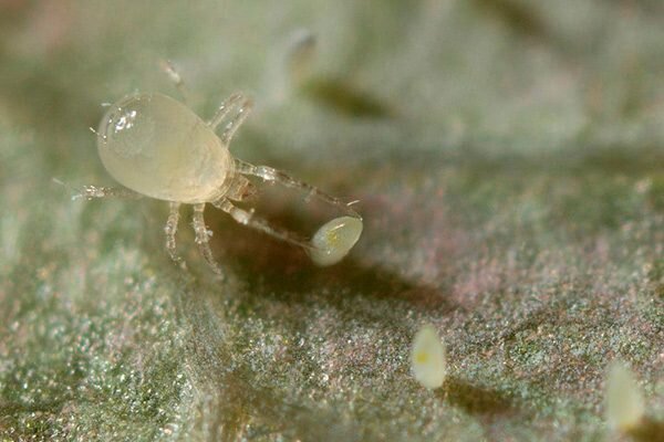 - Прозрачный. Это самый распространённый вид. Его размеры тела соответствуют показателям 0,19-0,20 мм, расцветка отсутствует, насекомое полностью прозрачно. Активно размножается во влажной среде. Питается соком из листьев клубники. Чаще всего встречается в весеннее время.