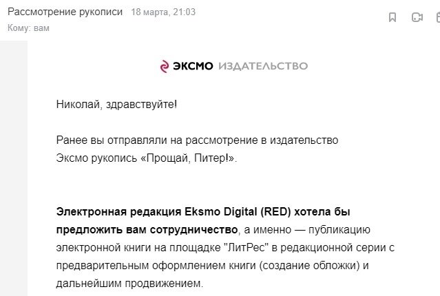 К слову, пока писал, присматривался к книжному миру, к издетельствам, к популярным автортудейплощадкам и к механике книжного бизнеса. Так вот. К моменту, когда пришел ответ от «Эксмо», я уже сам выложил свою книгу на Литрес и партнерские площадки. Что в этой схеме делает «Эксмо»? Полагаю, что сидит на потоке и снимает стружку. Что мешает авторам самим пройти регистрацию на Литрес? Разве что лень.