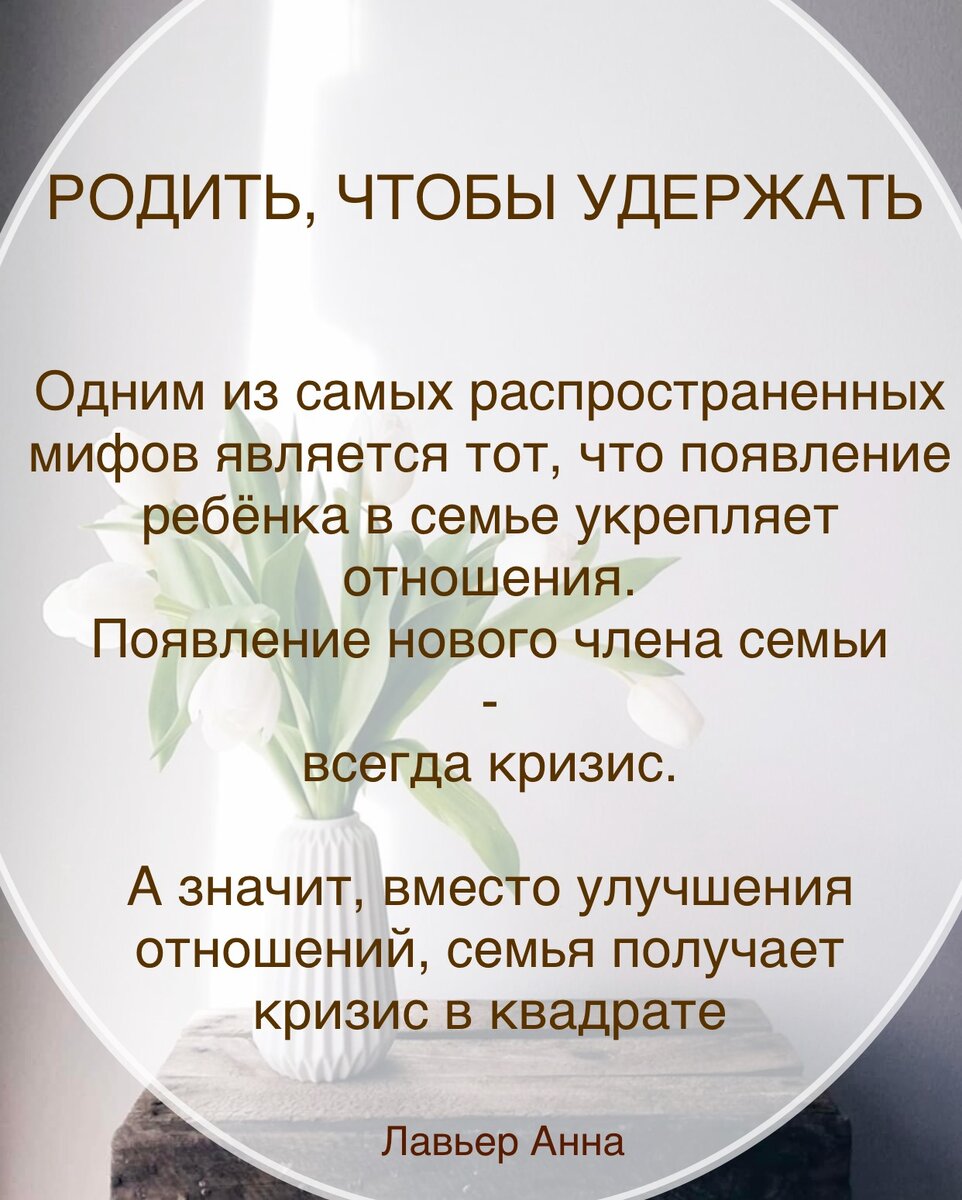 Одним из распространённых мифов, касающихся рождения детей является тот, что “ребёнок укрепляет брак”. Рождение ребёнка не простой этап в жизни семьи и отношения в этот период выжерживают испытание на прочность. М - миф “родить, чтобы удержать” Самым частым поводом для конфликта в паре, является тема - “кто и от чего устаёт больше”. Основными трудностями являются бытовые изменения. Уход за ребёнком требует “ведро” физических и эмоциональных сил. Разговоры в паре сводятся к узкому бытовому кругу. Романтические отношения вытесняются заботами, а сексуальные - усталостью. Старые способы снятия напряжения после конфликта могут оказаться теперь недоступны. Если раньше, женщине помогал шопинг, работа, встреча с подругами, то сейчас, она привязана к ребёнку и не просто не имеет возможности снять накопившееся напряжение. Она должна найти в себе силы ухаживать за ребёнком, играть с ним, улыбаться, успокаивать. Всё это рождает непонимание и отдаление. Так возникает порочный круг растущ