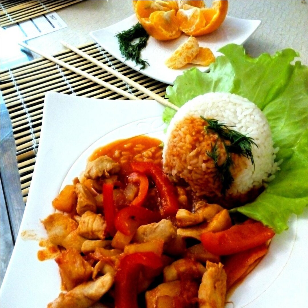 30 минут Ингредиенты 4 порции Куриное филе 500 г Соевый соус 10 столовых ложек Яблочный уксус 40 мл Сахар 5 чайных ложек Вода ½ стакана Томатная паста 2 столовые ложки Сладкий перец 1 штука Консервированный ананас 1 кусок Помидоры 2 штуказиорзину Инструкция приготовления 30 минут 1. Куриное филе нарезать тонкими полосками, сложить в миску, залить соевым соусом (примерно 6 столовых ложек) и немного поперчить. 2. Для приготовления соуса в глубокой сковородке, лучше в воке, смешать уксус, соевый соус (примерно 4 столовые ложки), томатную пасту. Поставить на огонь и прогреть, добавив часть сахара. Добавить воды, положить нарезанный полосками перец, консервированный ананас и помидоры. Попробовать на вкус. Если соус слишком кислый, добавить остатки сахара. Тушить на медленном огне около 10 минут. Овощи должны оставаться слегка твердыми. Соус должен быть в меру густым. 3. Обжарить курицу, соединить с соусом и потушить еще минут 10. Подавать с рисом.