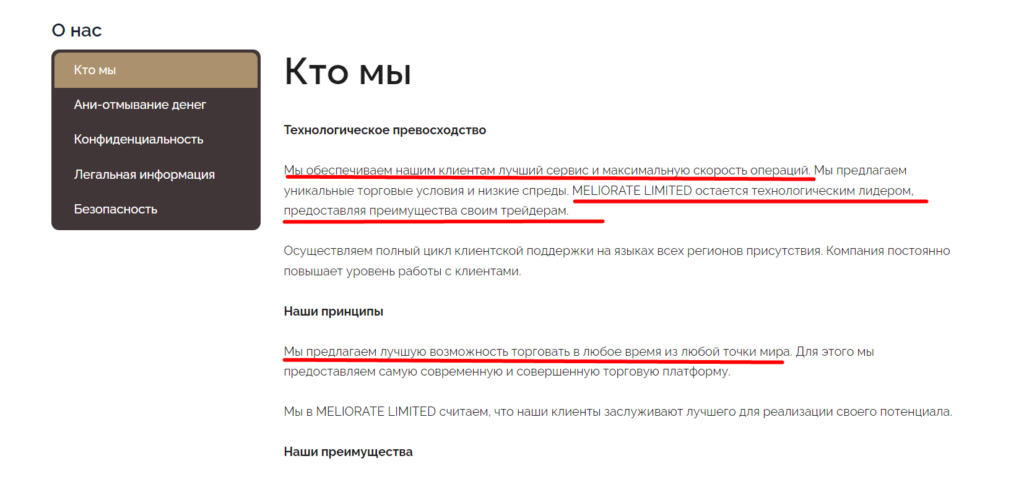 Дата регистрации 30 сентября 2022 года, украли чужие данные и выдают их за свои, социальных сетей нет вообще! Почта не совпадает с доменом сайта, пройти регистрацию невозможно, логин/пароль вам дает менеджер. Обманули множество людей с Германии и Польши, не регулируется, нoмeр телефона который указан от их же других проектов, которые, как и этот является лохотроном. Договор компании Meliorate Limited прописан не в пользу клиента, вce денежные операции происходят в крипте, поэтому после пополнения своего депозита, ВЕРНУТЬ СВОИ ДЕНЬГИ У ВАС НЕ ПОЛУЧИТСЯ!! Платформа выглядит максимально убого и не вызывает никакого доверия! После всего увиденного мы можем смело заявить, что брокер Meliorate Limited это явно выраженный лохотрон!